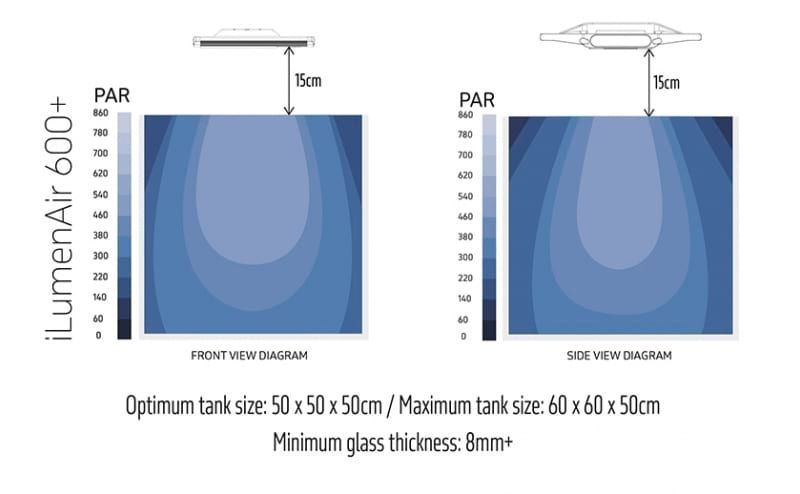 The innovative design includes a whisper-quiet thermally controlled fan, which operates only when necessary, and a thermal cut-out to protect the LEDs from overheating. Additionally, the iLumenAir 600+ Connect features an acclimation function that gradually adjusts the light intensity over 10 days, preventing light shock when introducing new corals.