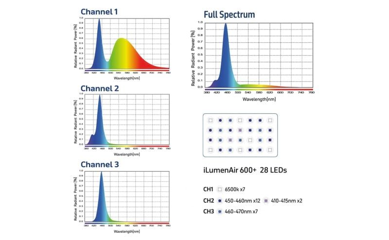 - Three separate light channels: 6500K white, 450-460nm blue, and 410-415nm violet
